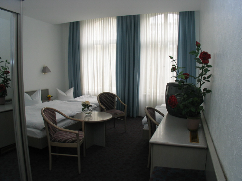 Hier sehen Sie eines unserer Mehrbettzimmer.Ebenso wie die Doppelzimmer sind sie geräumig und gut geschnitten, und die Einrichtung ist geschmackvoll und komfortabel, hell und gemütlich. Und natürlich praktisch.Zur Grundausstattung der Zimmer gehören ein eigenes modernes Bad und TV.