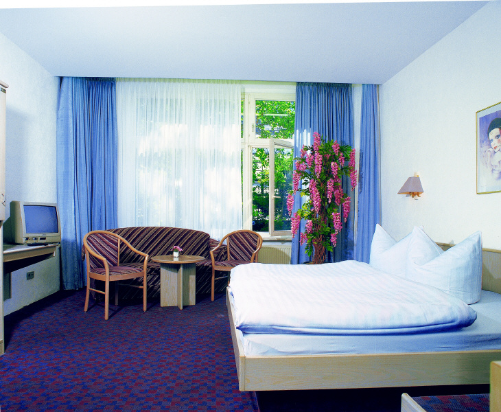 Hier sehen Sie eines unserer Doppelzimmer.Ebenso wie die Einzelzimmer sind sie geräumig und gut geschnitten, und die Einrichtung ist geschmackvoll und komfortabel, hell und gemütlich. Und natürlich praktisch.Zur Grundausstattung der Zimmer gehören ein eigenes modernes Bad und TV.